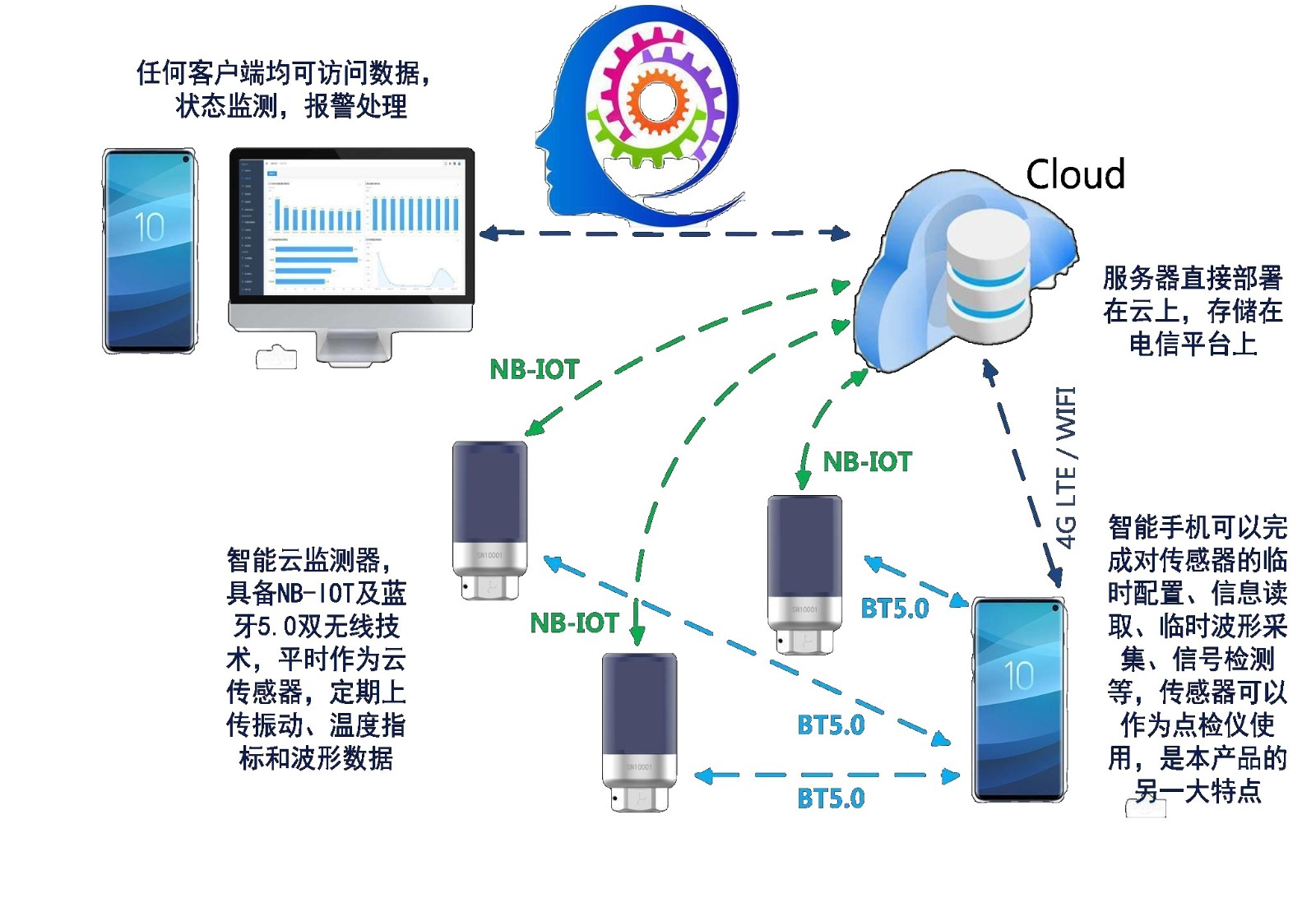 NB型無線智能監測器集成了(le)加速度(dù)、速度、溫度的采 集,內嵌了部分智能(néng)診斷算法(fǎ),可以預判和預警設備故(gù)障(zhàng),適(shì)用於工業設備的監測,是石化、電力(lì)、鋼廠等工業領域設備看護的利器(qì),產品集成了藍牙5.0與NBIOT技術,既可以通過藍牙與手機APP連(lián)接采集,也可以通過NBIOT直接連接雲端。