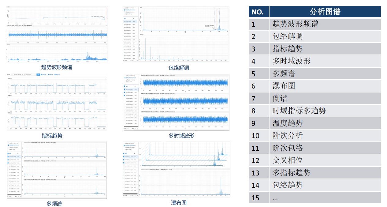 ⑥提供豐富的數據分析功能:時域波形、頻譜分析、長時域波形、指標趨勢、包絡解調、倒譜、瀑(bào)布圖等等。
